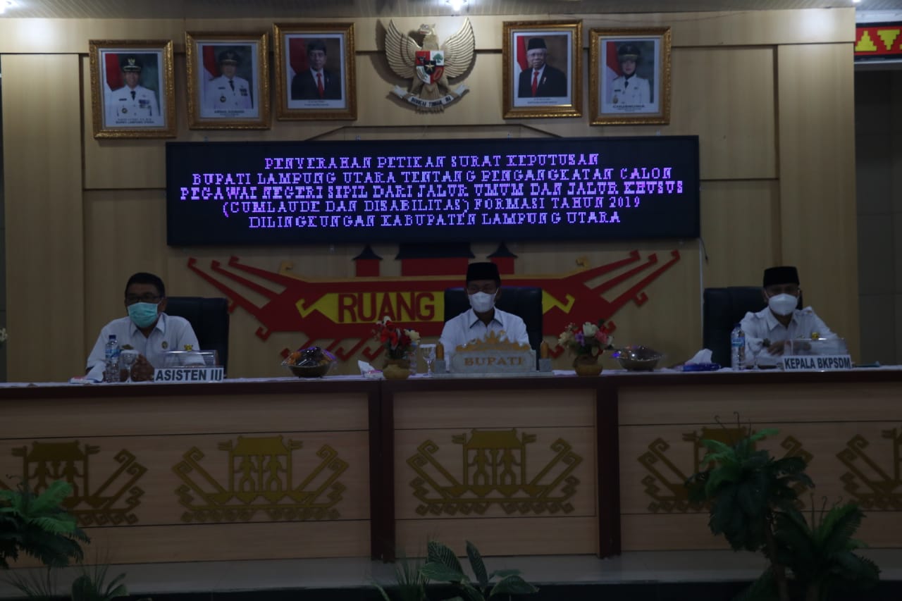 Lampung Utara, Suarainvestigasi.com –Penyerahan Petikan Surat Ke ygputusan Bupati Lampung Utara tentang Pengangkatan Calon Pegawai Negeri Sipil Jalur Umun dan Jalur Khusus Cumlaude dan Stabilitas Formasi 2019 di Lingkungan Kabupaten Lampung Utara. Di Aula Tapis Pemerintahan Kabupaten Lampung Utara. Rabu (30/12/2020).