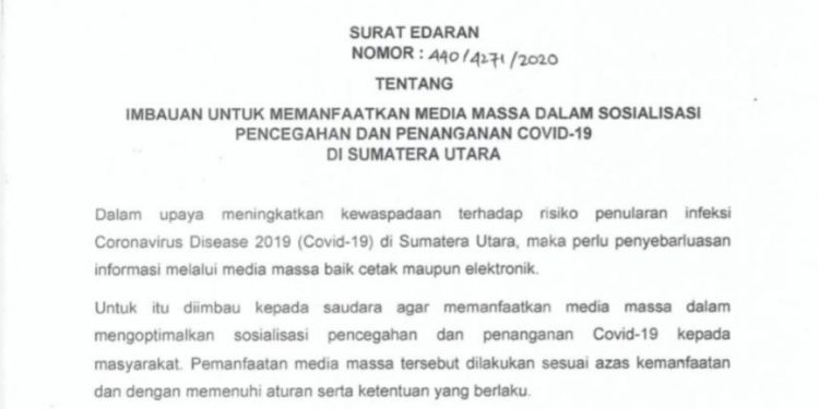 “Ini luar biasa, dalam SE itu Gubsu secara tegas meminta para bupati, walikota, SKPD (OPD) dan BUMD memanfaatkan media dalam sosialisasi pencegahan dan penanganan Covid 19,” ujarnya.