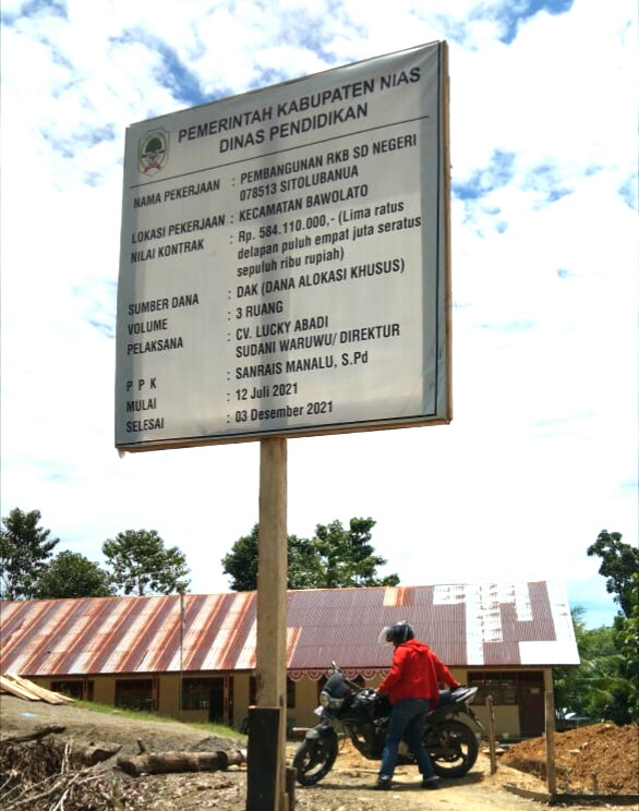Ketika Awak Media menemui Kabid PPK Dinas Pendidikan Kabupaten Nias di Ruang Kerjanya, Sanrais Manalu,S.Pd mengatakan benar SDN 078513 Sitölubanua, Kecamatan Bawölato, Kabupaten Nias sedang dibangun 3 (tiga) Ruang Kelas Baru dari Dana Anggaran Khusus (DAK) Tahun 2021 sebesar Rp. 584.110.000,- (lima ratus delapan puluh empat juta seratus sepuluh ribu rupiah) yang dimulai awal Pembangunan 12 Juni 2021 target selesai 03 Desember 2021 dengan Rekanan Kerja, Ucapnya Kabid PPK.