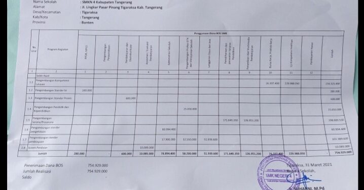 Kab.Tangerang, Suarainvestigasi.com –Sekolah Menengah Kejuruan (SMK) Negeri 4 kabupaten Tangerang, Banten tercatat telah merealisasikan dana Bantuan Operasional Sekolah (BOS) tahap 1 (Satu) tahun anggaran 2021 yang digelontorkan dari pemerintah pusat, adapun dana BOS yang diterima pada tahap 1 (Satu) ini sebesar Rp. 754.929.000.