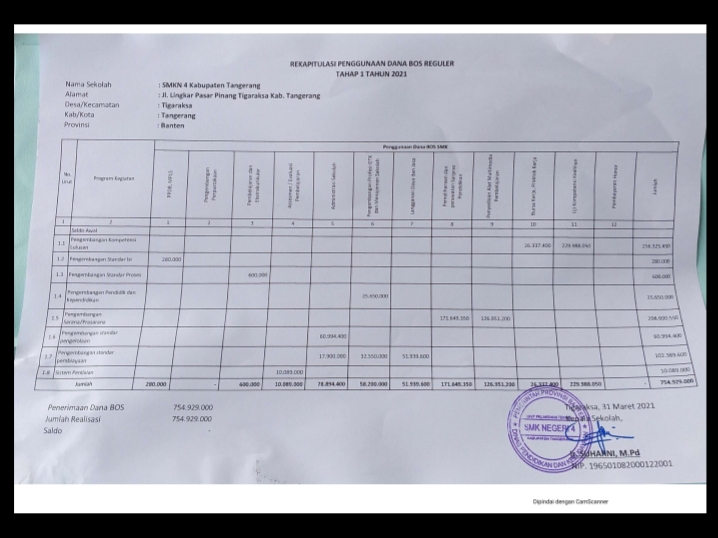 Kab.Tangerang, Suarainvestigasi.com –Sekolah Menengah Kejuruan (SMK) Negeri 4 kabupaten Tangerang, Banten tercatat telah merealisasikan dana Bantuan Operasional Sekolah (BOS) tahap 1 (Satu) tahun anggaran 2021 yang digelontorkan dari pemerintah pusat, adapun dana BOS yang diterima pada tahap 1 (Satu) ini sebesar Rp. 754.929.000.