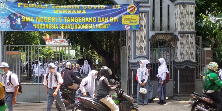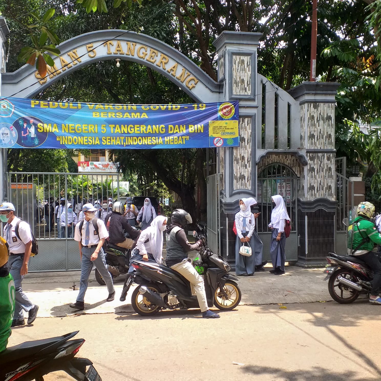 SMA Negeri 5 Kota Tangerang, Banten lembaga pendidikan yang melaksanakan Pembelajaran Tatap Muka (PTM) terbatas sejak awal September lalu, berdasarkan pantauan awak media, pada saat jam belajar selesai sesuai jadwal yang ditentukan. Tak ada jam istirahat, dan siswa pun langsung bergegas pulang dengan tertib, hal ini sesuai dengan aturan PTM terbatas yang telah ditentukan.