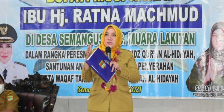 “Bismillahirrahmanirrahim, rumah tahfiz Qur’an Al-Hidayah Desa Semangus Kecamatan Muara lakitan, saya resmikan” Ucap Bupati Musi Rawas Hj Ratna Machmud sembari memotong pita peresmian.