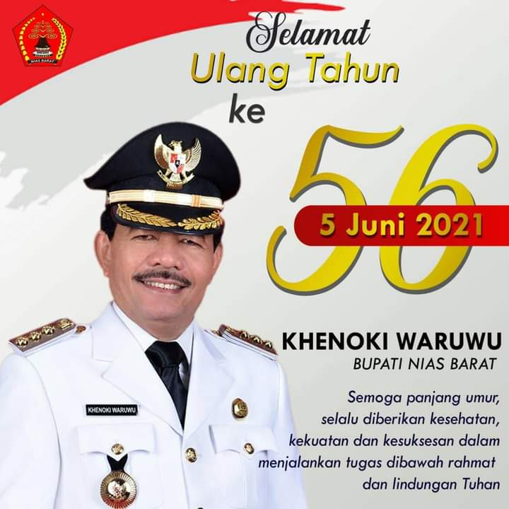 Nias Barat, suarainvestigasi.com –Bupati Nias Barat Bapak Khenoki Waruwu mengucapkan syukur atas anugerah besar Tuhan yang Maha Kuasa, dimana tepatnya pada hari Sabtu (05/06/2021, memasuki Umur Ke-56 tahun. Ucapan selamat dan dukungan dari berbagai pihak yang disampaikan lewat Media Sosial, (WhatsApp, Facebook, Instagram, dan Twitter). Hal tersebut disampaikan Bapak Khenoki Waruwu melalui Pesan singkat lewat Grup Media Sosial Pada hari Sabtu (05/06/2021).