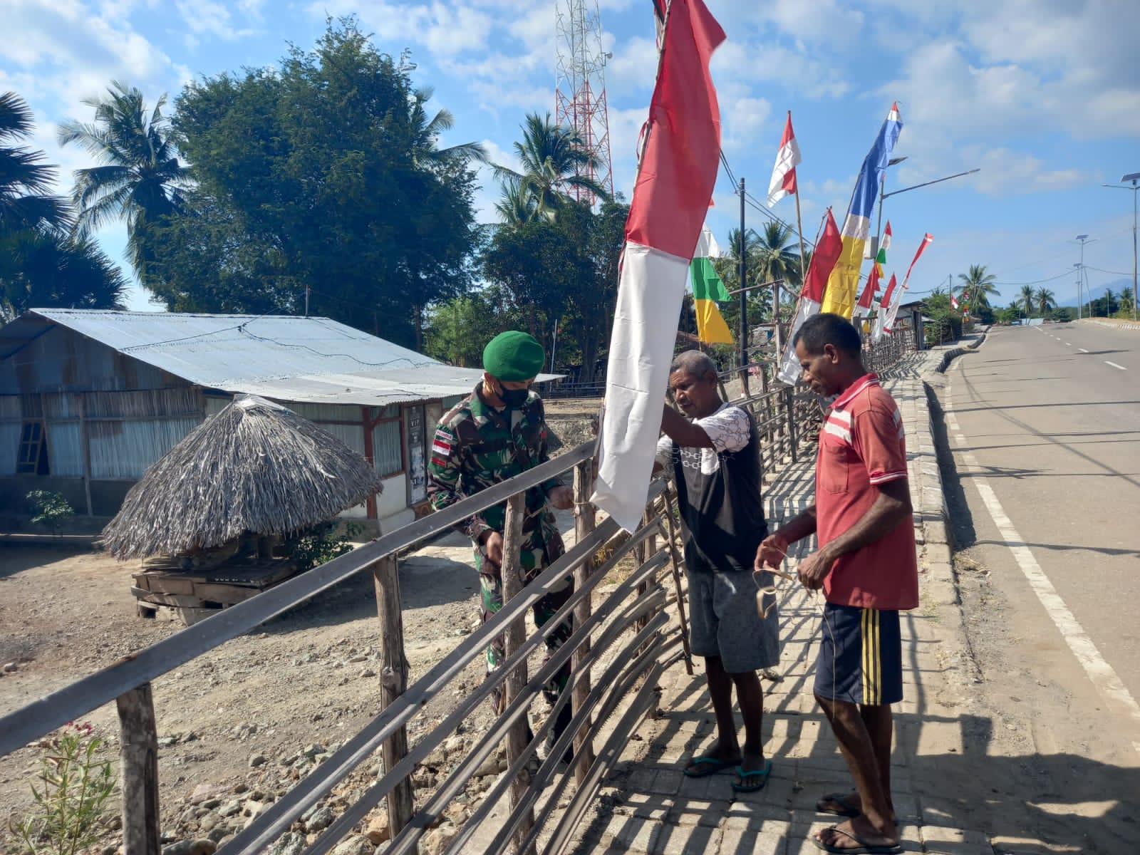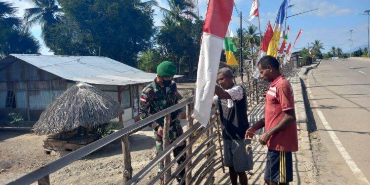 Berkaitan dengan peringatan Hari Proklamasi Kemerdekaan Republik Indonesia yang ke -76 tersebut, jajaran pos Satgas Pengamanan Perbatasan RI – RDTL Sektor Timur mengajak masyarakat di sepanjang wilayah perbatasan Kabupaten Belu Nusa Tenggara Timur untuk menyambut HUT Kemerdekaan RI ke 76 tahun 2021 dengan memasang bendera merah putih dan umbul-umbul di halaman rumah seperti yang dilakukan pos-pos Kipur I hari ini, Senin (2/8/2021).