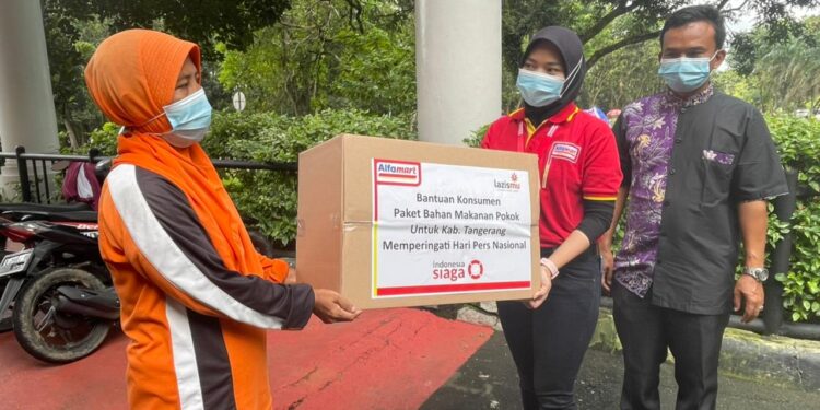 TIGARAKSA, Suarainvestigasi.com — Pekerja kebersihan di sekitar Kompleks Perkantoran Pemerintah Kabupaten Tangerang mendapatkan bantuan paket sembako dari LazisMu melalui donasi konsumen Alfamart. Kegiatan yang dihelat bersama Persatuan Wartawan Indonesia (PWI) Kabupaten Tangerang bertepatan dengan Hari Pers Nasional, Selasa (9/2/2021).