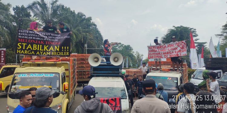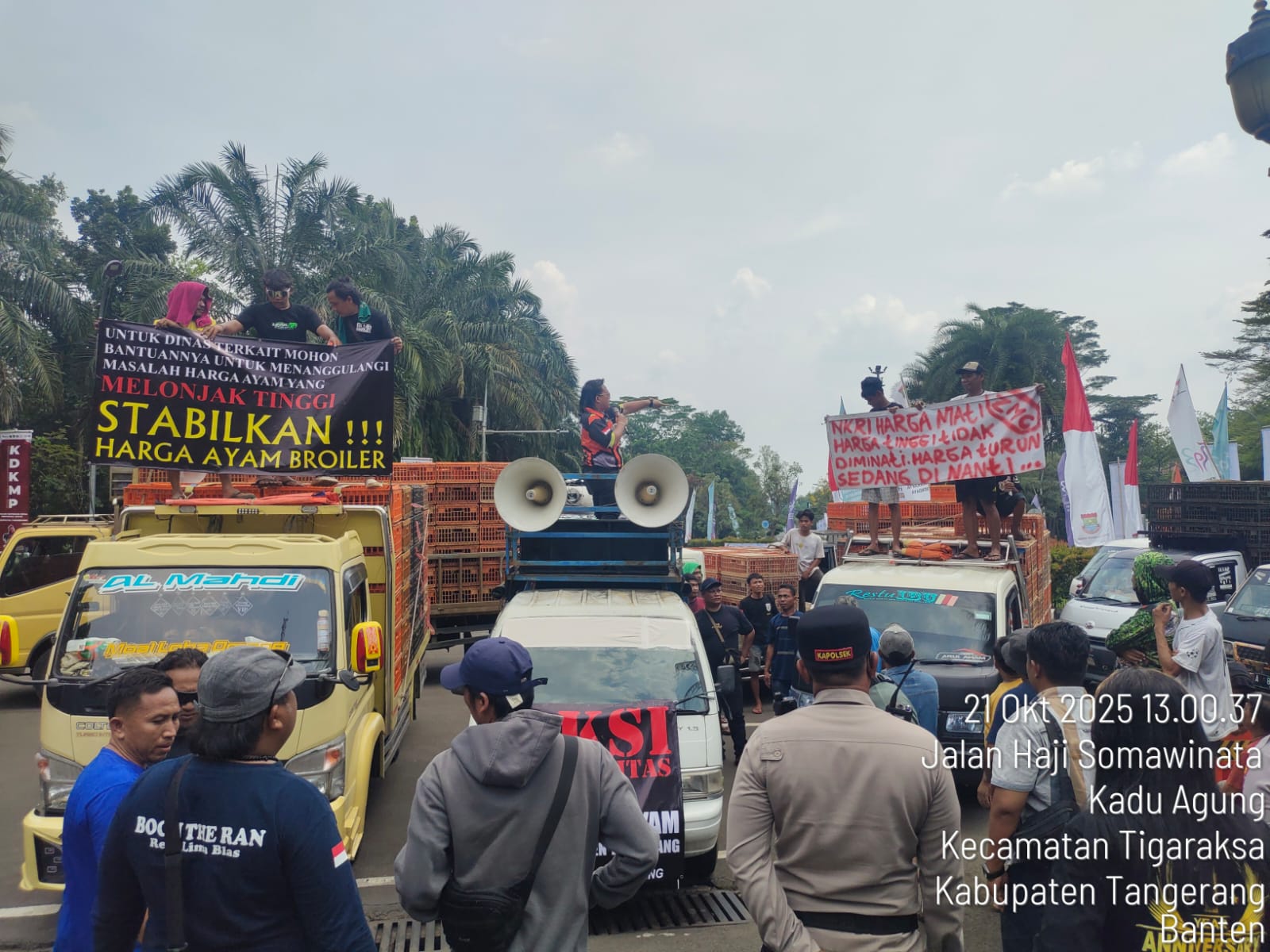 Kabupaten Tangerang – Media Suarainvistigasi.com – Para pedagang ayam yang tergabung dalam Asosiasi Pedagang Ayam se-Kabupaten Tangerang menggelar aksi unjuk rasa di depan Gedung Bupati Tangerang pada, Selasa (21/10/2025).