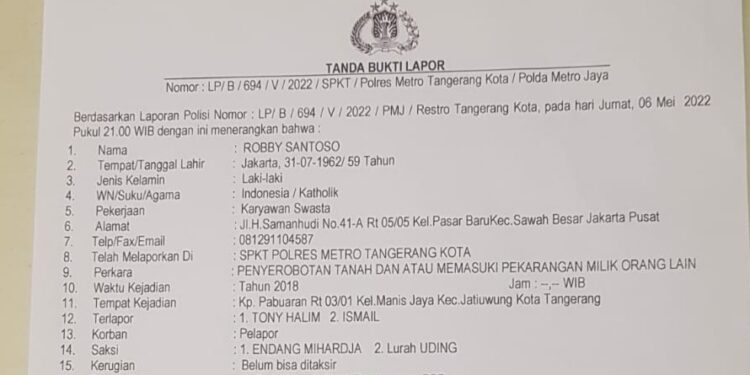 TANGERANG – Suarainvestigasi.com – Pemilik tanah laporkan adanya penyerobotan lahan yang dijadikan sebagai akses jalan oleh para pengusaha. Penyerobotan lahan tersebut tertuang dalam Nomor Laporan Polisi : LP/B/694/V/2022/PMJ/Restro Tangerang Kota.