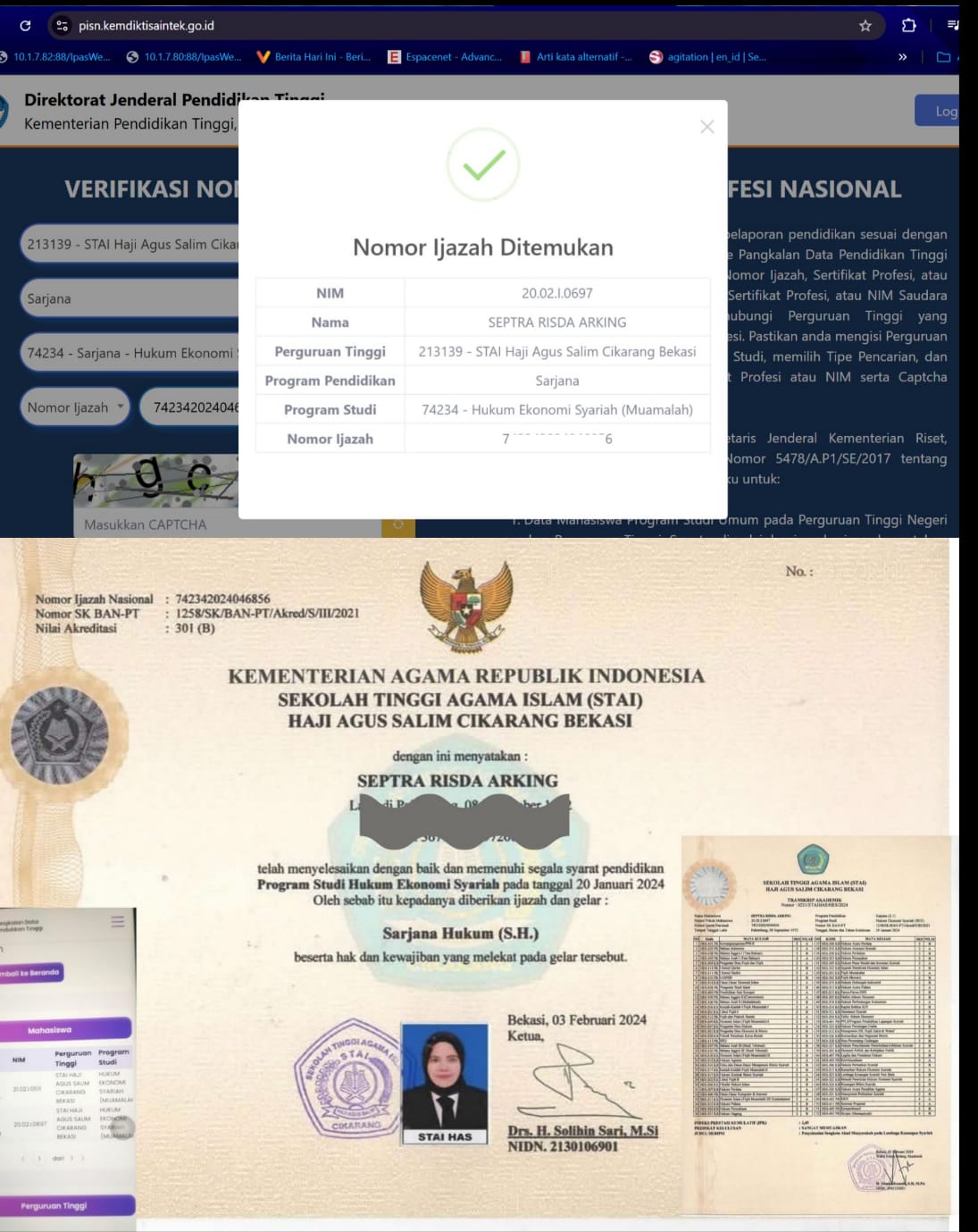 SEPTRA RISDA ARKING yang biasa di panggil RISDA ini menjawab tudingan ijazah palsu, kepada awak media mengatakan “bahwa ijazah saya adalah asli dan bisa di buka di laman pangkalan data pendidikan tinggi, saya juga saat ini sedang menempuh pendidikan magister hukum atau S2 disalah satu universitas.