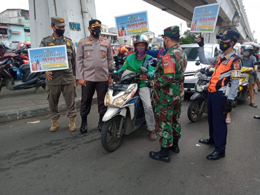 Kegiatan sosialisasi PPKM dan pembagian masker dipimpin langsung Kapolsek Tambora Kompol M.Faruk Rozi dengan menurunkan 23 petugas gabungan dari Koramil 02/TB, Polsek Tambora, Pol PP, Damkar dan Dishub