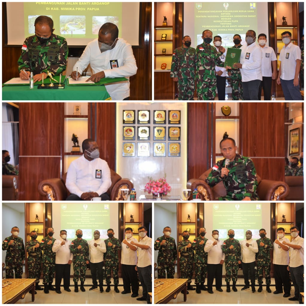 JAKARTA – Suarainvestigasi.com – Panglim Kodam XVII/Cenderawasih Mayjen TNI Ignatius Yogo Triyono, M.A menerima kedatangan pejabat Ditjen Bina Marga Kementerian PUPR dalam rangka Penandatanganan Perjanjian Kerjasama TNI AD dengan Kementerian PUPR tentang pembangunan ruas jalan Banti Aroanop Kabupaten Mimika Provinsi Papua di Ruang Cyloops Makodam XVII/Cenderawasih. Minggu (29/8/2021).