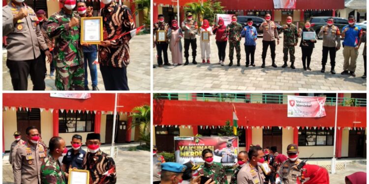 “Penyerahan Piagam penghargaan oleh Dandim dan Kapolres kepada perwakilan wilayah yang wilayahnya telah mencapai target dalam vaksinasi warganya “jelas Mayor Galib pada awak media.