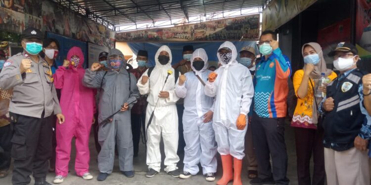 Selain pembagian masker lanjut dengan penyemprotan cairan disinfektan oleh anggota PMI disekitar RW 016 , Kel Kapuk , Kec Cengkareng , Jakarta Barat