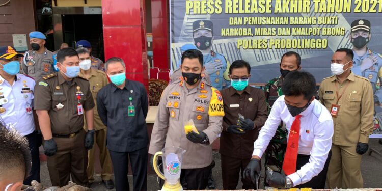 Probolinggo – Suarainvestigasi.com – Polres Probolinggo beserta Stakeholder terkait Forkopimda Kabupaten Probolinggo menggelar rilis akhir tahun dengan memusnahkan barang bukti Miras dan narkotika hasil tangkapan kinerja Polres Probolinggo selama setahun, di halaman Mapolres Probolinggo pada Senin pagi, (27/12/2021).