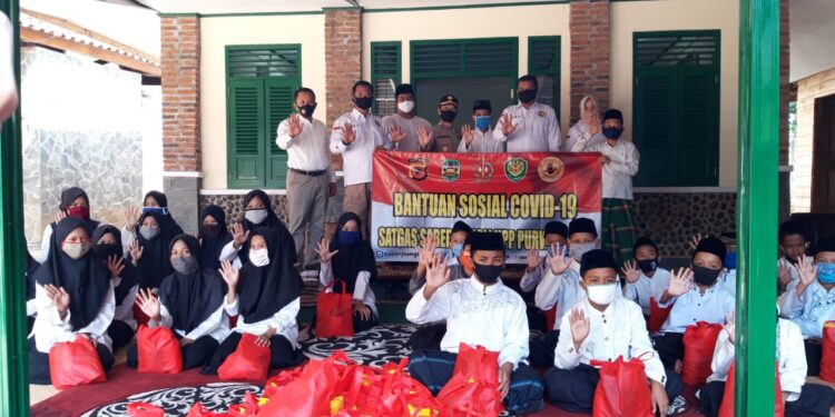 Paket sembako dibagikan Satgas Saber Pungli UPP di dua lokasi yakni Lembur Tohaga Lodaya Kampung tangguh Religi Panggeuing Covid 19 Pondok Pesantren Madonah Darul Barokah, Desa Dangdeur Kecamatan Bungursari dan di halaman Mapolsek Bungursari, pada Sabtu (18/7/2020).