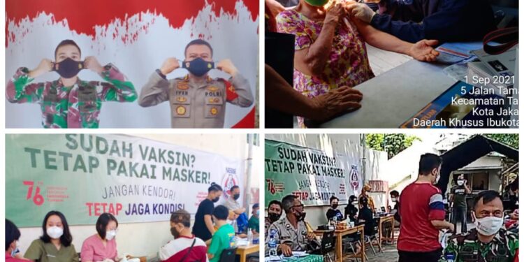 Jakarta Barat – Suarainvestigasi.com – Serbuan Vaksinasi di halaman stadion sepak bola Tamansari Jalan Mangga Besar VI Utara hari ini, Rabu 01 September mengambil thema” Masker Tetap Dipakai Walaupun Sudah Divaksin ” dengan fose Kapolsek Tamansari, AKBP Iver Son Manosoh dan Danramil 01/Tamansari, Mayor Inf Zulkarnaen Galib sedang memakai masker.