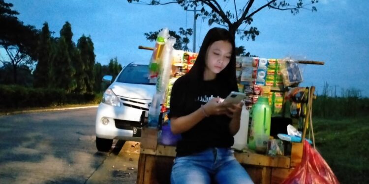 Leli gadis cantik, tidak merasa malu saat berdagang kopi keliling Di Perumahan Centraland Desa Kebasiran Kecamatan Parungpanjang Kabupaten Bogor..